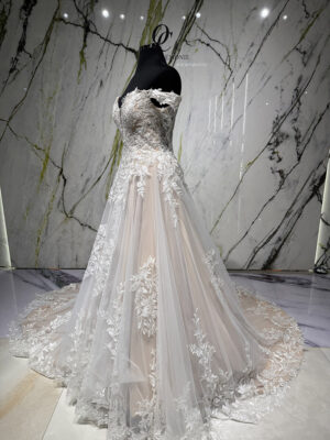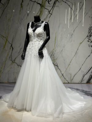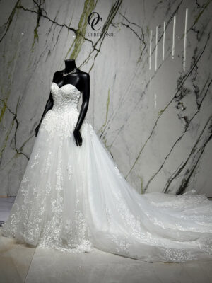 Traîne : Dotée d’une très jolie traîne travaillée, parfaite pour une entrée remarquée.