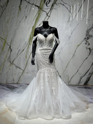 La robe Limoges est l’incarnation du raffinement et de l’élégance. Ce modèle sirène se distingue par une superposition complexe de dentelles et de détails scintillants, offrant une allure prestigieuse et sophistiquée.