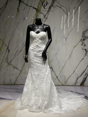 Traîne : Une somptueuse traîne ornée de rappels de dentelle vient parfaire l’allure de la robe.