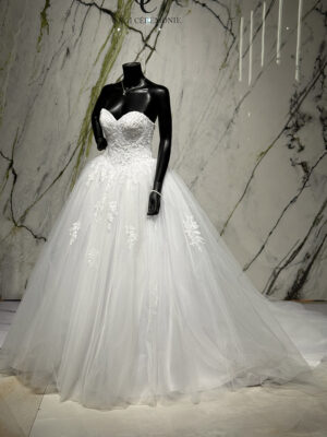 La robe Malaga est une pièce majestueuse qui incarne le romantisme par excellence. Ce modèle princesse se distingue par un travail de dentelle raffiné et une traîne spectaculaire, offrant une silhouette royale et inoubliable.