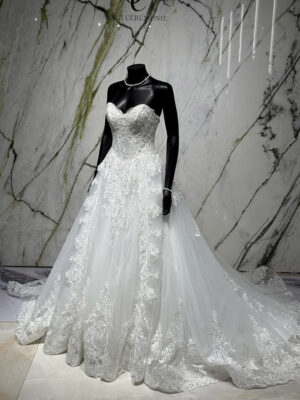 Traîne : Une très longue traîne travaillée, ornée de rappels de dentelle, pour un effet spectaculaire.
