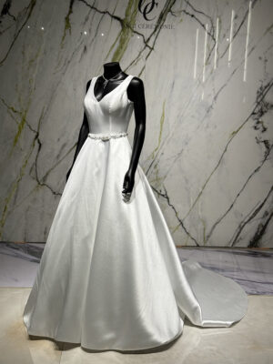 La robe Pamplona est une création majestueuse qui incarne l’élégance du style princesse avec une touche de romantisme intemporel. Ce modèle se distingue par l’utilisation de la dentelle de Venise et son volume généreux, idéal pour une mariée cherchant une allure royale et structurée.