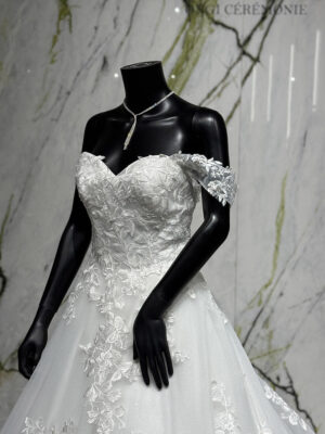 La robe Pescara est une création d’une grande douceur, idéale pour une mariée à la recherche d’un look romantique et vaporeux. Ce modèle se distingue par sa légèreté et ses détails floraux délicats, offrant une silhouette gracieuse et aérienne.