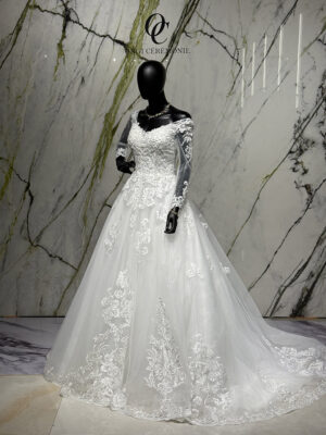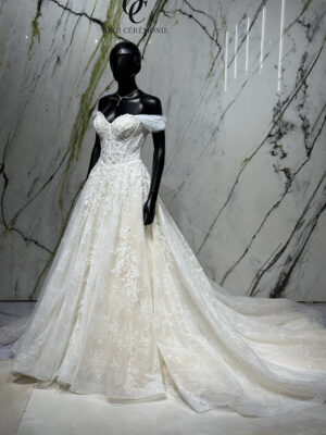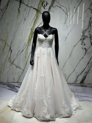 La robe Trapani est une création majestueuse qui incarne l’élégance du style princesse avec une structure raffinée. Ce modèle se distingue par l’utilisation de la dentelle de Venise et son volume impressionnant, idéal pour une mariée cherchant une allure royale et intemporelle.