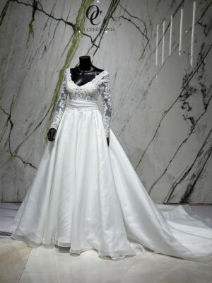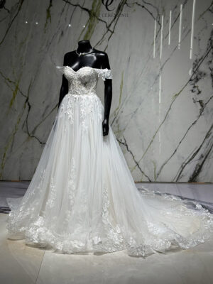 Le modèle Versailles est l’incarnation de la robe de mariée classique et majestueuse. Avec son volume imposant et ses détails de dentelle raffinés, elle offre une allure royale et intemporelle pour une entrée spectaculaire.