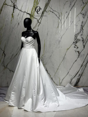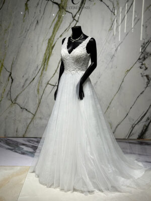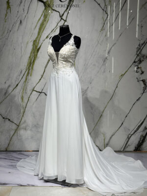 La robe Zamora est l’incarnation même de la douceur et de la légèreté. Ce modèle bohème se distingue par son allure vaporeuse et ses finitions délicates, offrant une silhouette gracieuse idéale pour une mariée en quête de naturel et d’élégance.