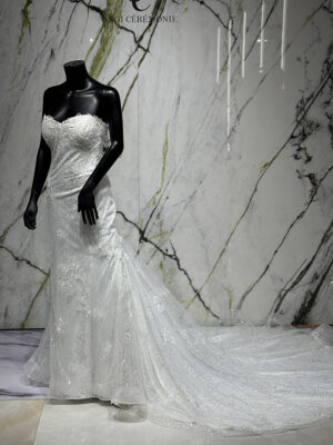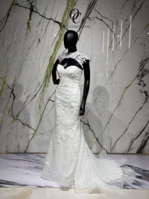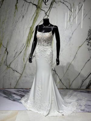 Le modèle Zaragoza est une robe sirène d’exception, conçue pour souligner la silhouette avec une élégance moderne et audacieuse. L’alliance du crêpe et de la dentelle de Calais offre un équilibre parfait entre structure et raffinement.